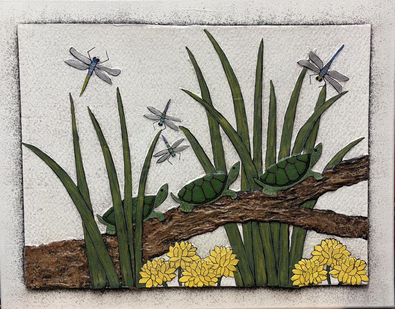Each large piece begins as a stretched canvas. The center is built up to form a framelike border. All the design elements are built up further to form a three dimensional design. Each piece is designed, built, and painted individually by hand. Ready for hanging with a wire across the back.
